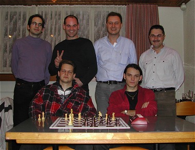 Munot Schaffhausen I - Rheintal II 1½ : 4½Urs Benninger 0, Stefan Marte 1, Erwin Frei ½, Gilbert Jost 1, Bruno Spälti 1, Enrique Lorita 1 Schweiz. Mannschaftsmeisterschaft, Stichkampf um den Aufstieg in die 1. Liga Wir sind wieder oben!Es ist geschafft! Nach einem unfreiwilligen Abstecher in die zweite Liga kehrt der Schachclub Rheintal (SCR) in die höchste Amateurliga zurück. Im Stichkampf gegen Baden II gaben sich die Spieler um Mannschaftskapitän Markus Wittwer keine Blösse und gewannen mit 4:2 Punkten. Keres, skandinavisch, russisch, Caro-Kann, französisch, sizilianisch - was sich nach einem unverständlichen Kauderwelsch anhört, ist die korrekte Bezeichnung für die Eröffnungssysteme, die an den sechs Brettern zur Diskussion standen. Beide Seiten hatten sich gründlich auf den Stichkampf vorbereitet. Hier sassen sich keine müden, ausgelaugten Gestalten gegenüber, sondern 12 ambitionierte Denksportler, die kein Risiko scheuten. Nach vier Stunden eröffnete Mirko Oertle das Score mit einem Schwarzsieg über Jean-Pierre Z'berg. Er hatte die weisse Stellung Zug um Zug eingeschnürt, bis der Aargauer aus Raummangel zugrunde ging. Nun war der Bann gebrochen. Robert Mrsic führte eine zunächst gleichwertige Partie durch aggressives Vorgehen noch zum verdienten Sieg. Klaus Doskocil sah sich einem heftigen Opferangriff von Werner Brunner ausgesetzt. Doch irgendwo verlor Brunner den Faden und Klaus konnte die Zitterpartie noch kippen. Markus Wittwer griff wie immer zur französischen Verteidigung. Schon nach wenigen Zügen übernahm er die Initiative und setzte Friedhelm Löffelhardt unter Druck. Leider vernachlässigte er in der Zeitnotphase die Königssicherheit und in bereits desolater Stellung überschritt er kurz vor dem 40. Zug die Zeitlimite. Am längsten, nämlich fünf Stunden, brauchte Rico Zanga bis zum Matchpoint. Mit einem riskanten Springeropfer zertrümmerte er die gegnerische Rochadestellung. Der Angriff drang zwar nicht durch, doch die schwarzen Springer standen derart unglücklich, dass Rico die Figur zurückerobern konnte. Mit zwei Mehrbauern war es für ihn ein Leichtes, den Sieg und damit den Aufstieg für den SCR zu bewerkstelligen.