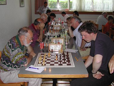 Springer-Sihlfeld I - Rheintal I 4½ : 3½Peter Dittmar - Sandro Schmid ½:½, Hermann Koch - Rico Zanga ½:½, René Meier - Klaus Doskocil 1:0, Daniel Kuchen - David Grüninger 1:0, Werner Aeschbacher - Robert Sandholzer 0:1, Hansjakob Emch - Robert Hauser 0:1, Ewald Wyss - Markus Christen ½:½, Jakob Bürgi - Enrique Lorita 1:0 Friesenberg-Zürich I - Rheintal II 2:3Gerold Forster 0, Mario Milo 0, Gerd Fischer 1, Willi Zäch 1, Kurt Kengelbacher 1 Rheintal III - Wil IV 1:3Marco Fehr 0, Yannik Hutter 0, Roger Schönenberger 0, Ruedi Götti 1 SGM 7-02: Versöhnlicher Abschluss für den SCRIn der siebten und letzten Runde der schweizerischen Gruppenmeisterschaft trennten sich der SCR und Bianco Nero Lugano 4:4 unentschieden. Beide Teams konnten unbeschwert aufspielen, denn der Gruppensieger (Nimzowitsch Zürich) und der Absteiger (Wettingen-Spreitenbach) standen schon vor der Schlussrunde fest. So friedlich, wie man aufgrund des Schlussresultates annehmen könnte, verlief das Geschehen auf den Brettern allerdings nicht. Bianco Nero war mit einer jungen, dynamischen und vor allem ehrgeizigen Mannschaft ins Rheintal gekommen. Das Durchschnittsalter der Tessiner lag bei 24 Jahren, die Gastgeber hatten zusammen immerhin schon 281 Jahre auf dem Buckel. Man rechne. Die jungen Burschen machten von Anfang an klar, dass sie die lange Anreise nicht unter die Räder genommen hatten, um Geschenke zu machen, sondern um kräftig Hiebe auszuteilen. Sie drängten die Rheintaler bald einmal in die Defensive und führten nach viereinhalb Stunden überlegen mit 2:4 Punkten. Die Lage war hoffnungslos, aber nicht ernst. Sandro Schmid besass zwar einen Mehrbauern, doch Enrique Lorita stand jenseits von Gut und Böse. Der schwarzen Bauernwalze im Zentrum war er wehrlos ausgeliefert. Doch dann geschah das Unfassbare. Anstatt seinen Vorteil langsam aber sicher zu verwerten, ging Joel Kruell auf Bauernraub aus und unterschätzte die Gefahr, die von den weissen Türmen ausging. Die Situation änderte sich schlagartig. Plötzlich gewann Enrique Material und die schwarze Stellung fiel wie ein Kartenhaus zusammen. Wieder einmal hatten sich Hartnäckigkeit und Ausdauer bezahlt gemacht. In der Zwischenzeit war auch Sandro Schmid nicht untätig geblieben. Zug um Zug hatte er seine Position verbessert, bis sein junger Gegner in eine Fesselung lief und zermürbt aufgab. Alles in allem ein glückliches, aber nicht unverdientes Unentschieden für die "Rheinholzer". Rheintal I - Bianco Nero Lugano I 4 : 4Markus Wittwer - Nicola Ambrosiani 0:1, Klaus Doskocil - Giovanni Laube 1:0, Robert Sandholzer - Vladimir Paleologu ½:½, Sandro Schmid - Aurelio Colmenares 1:0, Robert Hauser - Andrea Caldelari ½:½, Robert Mrsic - Nicola Ermotti 0:1, Urs Benninger - Gabriel Kruell 0:1, Enrique Lorita - Joel Kruell 1:0 Schlussrangliste