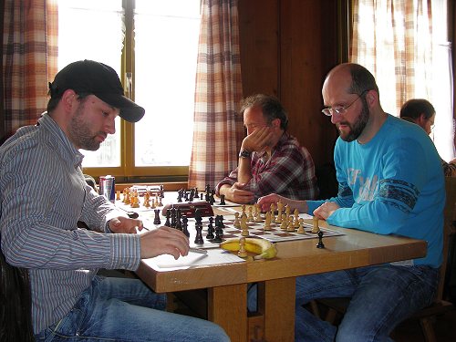 Die Schachszene ist nicht so gross, als dass man sich aus den Augen verlieren könnte. Wir bleiben durch den wundervollen Schachsport miteinander verbunden. Zum Schluss möchte ich Euch noch einen Tipp von Gernot mit auf den Weg geben, der Euere Schachbilanz schlagartig verbessern wird: "Leute, macht fleissig Fehler, dann wird der Gegner ganz Sturm im Kopf!" In diesem Sinn alles Gute Kurt Kaufmann Schweizerische Mannschaftsmeisterschaft 7. Runde: Rheintal 2 - Davos 1 3½:2½ SMM 7-12: Wenn David gegen Goliath gewinntIn der siebten und letzten Runde der Schweizerischen Mannschaftsmeisterschaft bekam es Rheintal 2 mit einem schweren Brocken zu tun: Davos 1. Doch der Favorit wankte nicht nur, er fiel sogar. Elo-Punkte sind im Schachsport das A und O. Die Skala beginnt bei 1000 Punkten (Anfänger) und endet bei etwa 2800 Punkten (Weltmeister). Davos protzte mit einem Elo-Durchschnitt von 1970 Punkten, die Gastgeber brachten es gerade mal auf bescheidene 1710 Punkte. Statistisch betrachtet hätten die Rheintaler mit 1½:4½ Punkten untergehen müssen. Taten sie aber nicht. Davos mit viel RespektDer Wettkampf hatte erst so richtig begonnen, da machte Dragan Vulevic am ersten Brett schon ein Friedensangebot. Er handle eben im Interesse seiner Mannschaft, fügte er beschwichtigend hinzu. Er dachte wohl, dass seine Kollegen und insbesondere sein Bruder Vjekoslav schon die Kohlen aus dem Feuer holen würden. Rudolf Gautschi suchte sein Heil ebenfalls in einem Remisangebot, allerdings nicht aus mannschaftstaktischen Gründen, sondern weil ihn Kurt Lesjak gehörig unter Druck setzte. Lieber den Spatz in der Hand als die Taube auf dem Dach, dachte sich Kurt angesichts der ungleichen Elo-Verhältnisse und schlug ein. Den Vogel aber schoss Markus Zoller ab, der dem um 464 Elo-Punkte höher eingestuften Vjekoslav Vulevic Paroli bot. Anfangs diktierte der hohe Favorit das Geschehen, doch dann befreite sich Markus mit einem Bauernopfer und erhielt gutes Gegenspiel. Der FIDE-Meister büsste den Mehrbauern wieder ein und musste sich in absolut gleichwertiger Stellung mit einem halben Punkt begnügen.
